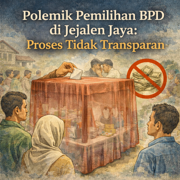 ALEPolemik Pemilihan BPD di Jejalen Jaya: Proses Tidak Transparan, 19 Ketua RW DiabaikanN JAYA, TAMBUN UTARA – Menjelang pemilihan kPolemik Pemilihan BPD di Jejalen Jaya: Proses Tidak Transparan, 19 Ketua RW Diabaikanepala desa periode 2026–2034, masyarakat Desa Jejalen Jaya, Kecamatan Tambun Utara, Kabupaten Bekasi, dihadapkan pada dua persoalan serius: pertama, ancaman politik uang yang menggerus moral kepemimpinan, dan kedua, proses pemilihan Badan Permusyawaratan Desa (BPD) yang dinilai tidak transparan dan mengabaikan peran ketua lingkungan.